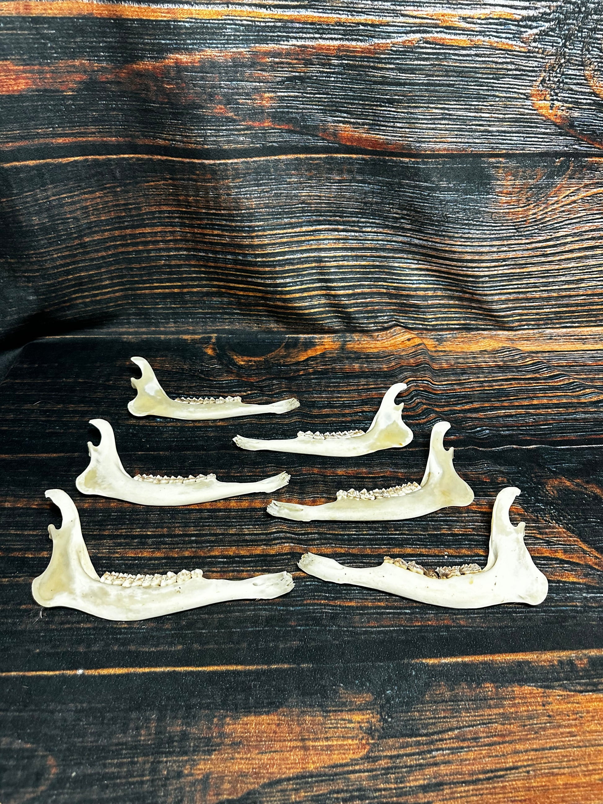 Up For sale is a lot of 6 Deer jaws. They are good jaws (See Pics) These are nice clean jaws. The jaws measure about 10 1/2 inches long, and around 1 3/4 inch wide at the widest width. These jaws are great for decoration for Halloween, knife handles or any craft projects. You will receive 6 jaws like what’s pictured.